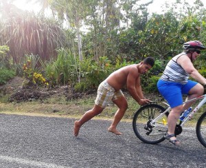 What a long hot day’s ride this was and yet it started so beautifully! We left later than what we had planned and were on the road by 8am. Cycling along in the cool, fresh, clean morning air was so uplifting. Everything smelt and looked like it had been washed clean from last night’s storm. The colours were all so vivid and bright. The greens of the jungle, the turquoise blues of the ocean, the reds and pinks of the flowers and the yellow and orange of the village fales were a feast for the eyes. We sped along through the quiet and peaceful coastal villages delighting in it all, big smiles on our faces.